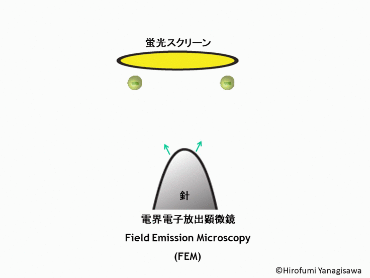 FEMでは、図2に示しますように、ナノスケールに先のとがった金属の針を用います。この針先から、電子を出します。電子は針先から広がり出ていきます。蛍光スクリーンに電子が到達すると、電子が当たった場所が光ります。この発光を利用し、スクリーン上に到達した電子を観測すると、針先端のナノスケールの情報を拡大し観測することができます。これがFEMです。(簡単なFEM紹介動画も用意してあります。)