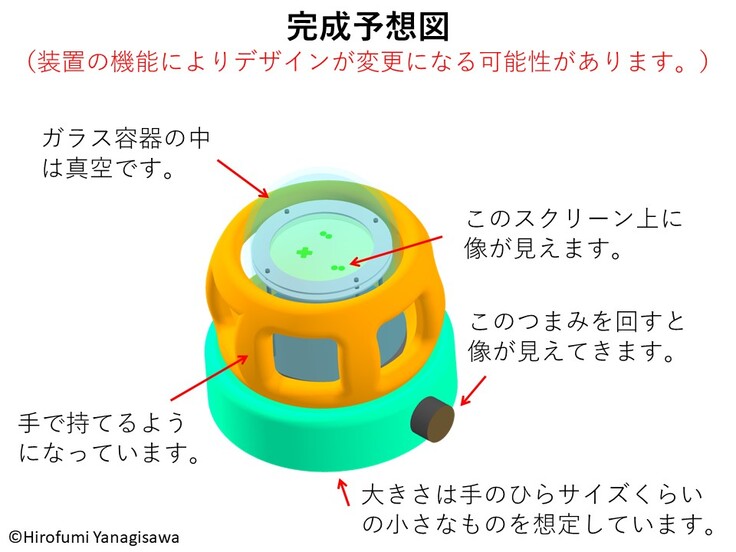 仮に、我々の想定通りFEMを真空管同様に作製できたとすると、出来上がる顕微鏡は図6の完成予想図のような物になります。サイズ感としては手のひらにのる程度の小さいものです。できたら電池で動かし、手で持ちながらスクリーンに映し出された1分子の量子のお花模様を観測できるようにします。