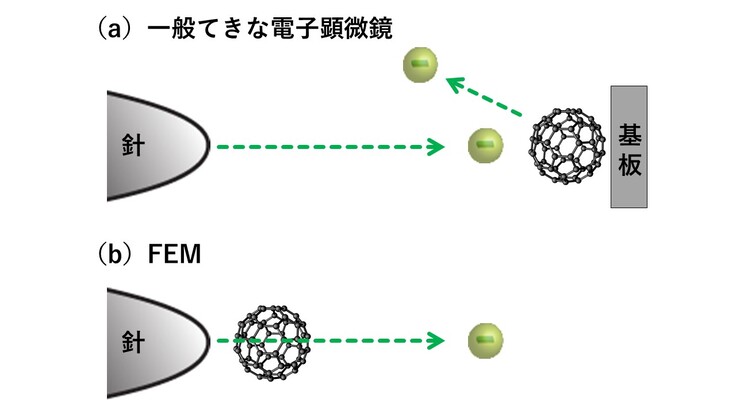 図3:一般的な電子顕微鏡とFEMでものを見るときの違いを示した概念図。