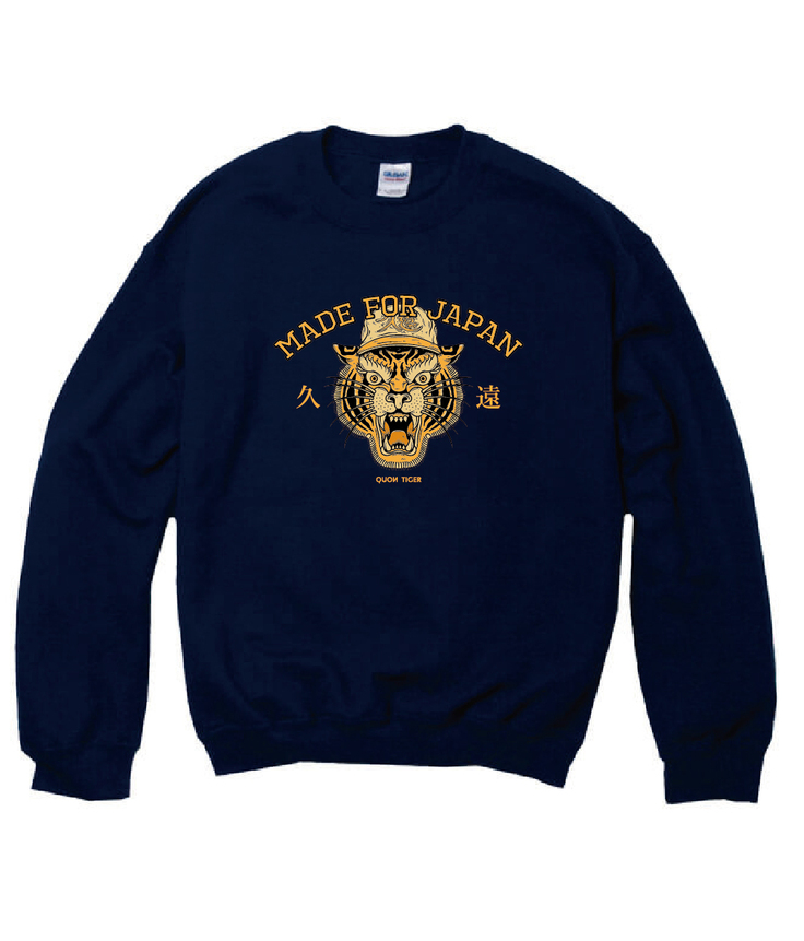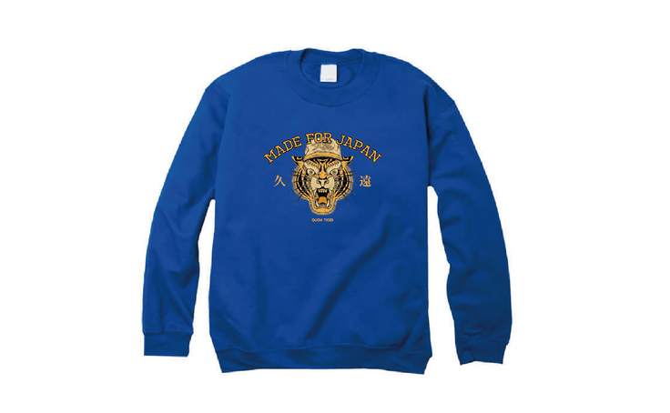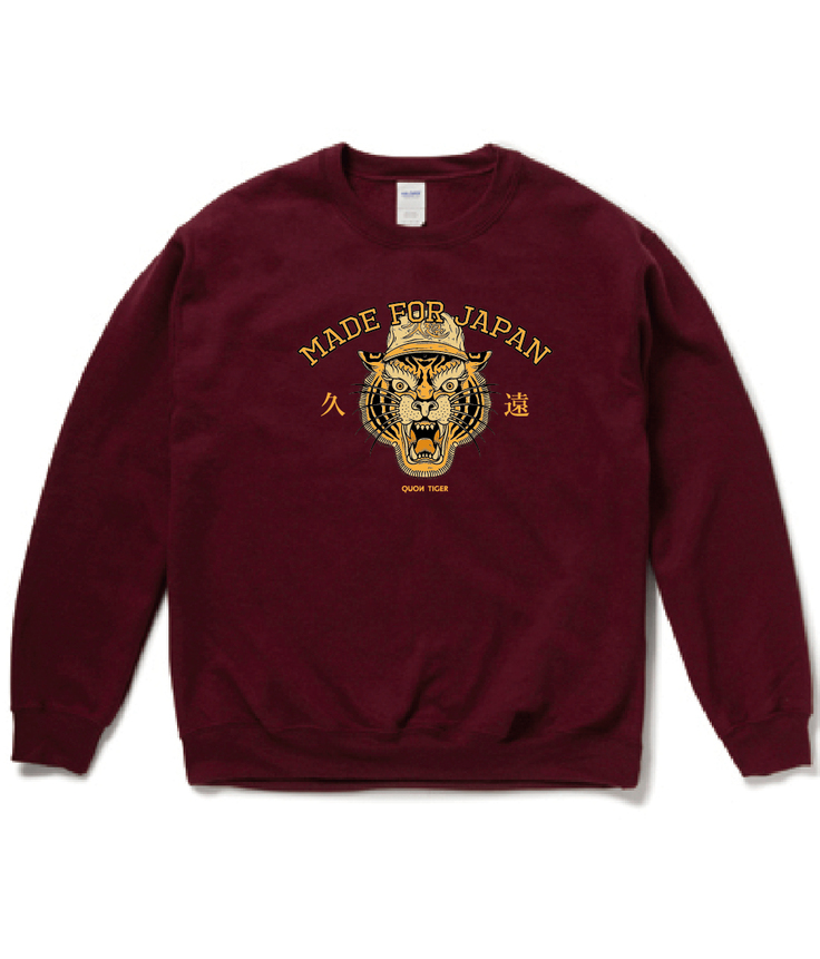スウェットの中心にQUON TIGERを配置したインパクトのあるデザイン。長く着て味が出るようにカレッジテイストを取り入れた。