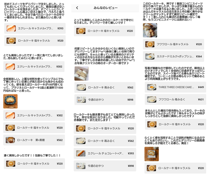 ロールケーキも焼き菓子も全てとても美味しかったです。幸せな気分になりました。宅配やっていただき感謝です。また注文します!どうしても甘いものが食べたくなってお写真にひかれて注文させてもらいましたが、本当に想像以上に美味しくて…今まで食べたロールケーキの中で1番美味しかったです。あまりに美味しくて写真を撮り忘れてました。笑何度リピートしたか分からないくらい美味しいのでデリバリーしてます(*^ω^*)身体に優しいお味で周りにも好評で、ちゃんと使っているお素材のクオリティの分かる方ならなおさら感動が大きいとおもいます。丁寧ですし引き続き応援したいお店です(*^ω^*)初めてスイーツをデリバリーで注文しました。とってもおいしくてびっくりしました。普段は選ばないロールケーキを頂きましたが、すごくしっとりしていてクリームも程よい甘さと軽さで、ぺろりと食べてしまいました。今まで食べたロールケーキの中で一番好きかもしれません。また頼みたいと思います。とっても美味しくふかふかのロールケーキで幸せになりました。デリバリーできて嬉しいです!連日での注文です。上品なロールケーキです。全部美味しい。上質な材料を使ってシンプルにでも丁寧に作っている感じが見た目からも味からも伝わってくる。いつも美味しいスイーツありがとうございます!!!またお願いします!このロールケーキ、神です!普段コンビニスイーツばかり食べてましたが、やっぱり洋菓子屋さんのロールケーキは違うなぁと思いました。スポンジに染み込んだキャラメルのほろ苦さと中の軽く爽やかなクリームがマッチしすぎて絶対リピート確定です!!!差し入れにも喜ばれる事間違いなし!嗚呼、もうコンビニスイーツには戻れない!写真が素敵なので期待していたのですが、期待以上のクオリティでした!全体的に甘過ぎずさっぱりしてるのですが、スイーツ食べてる感もありリピート確定です。