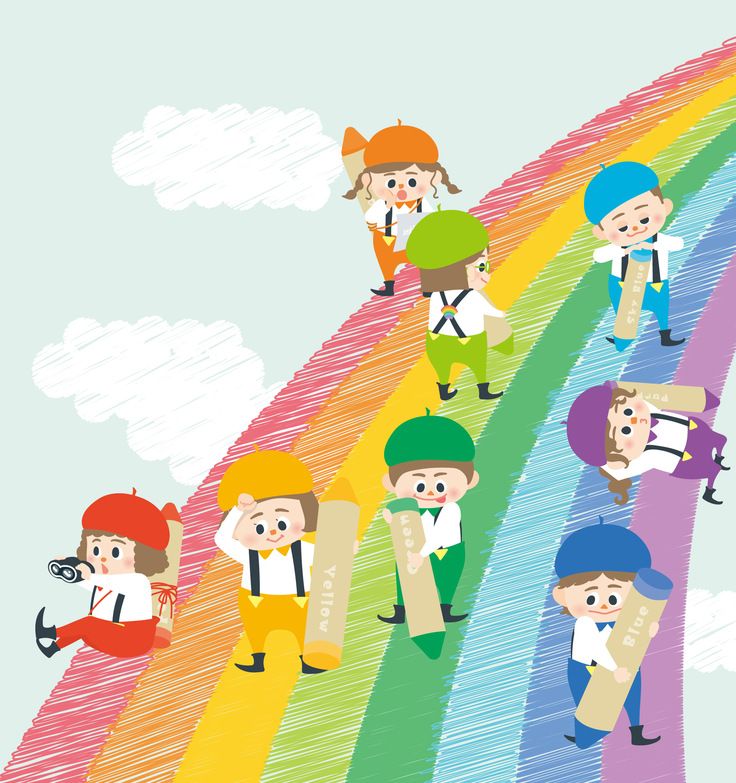 「にじいろクレヨン」のお友達「ゆうちゃん」は、一人では気づけなかった「らしさ」をお友達のクレヨンを貸してもらうことで、一生懸命見つけ、きれいな虹を作っています。