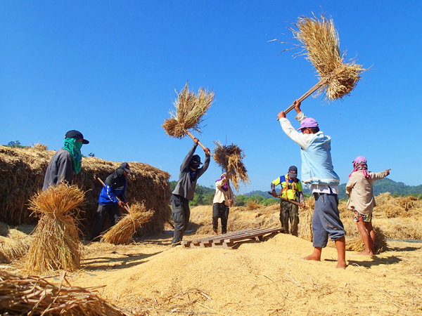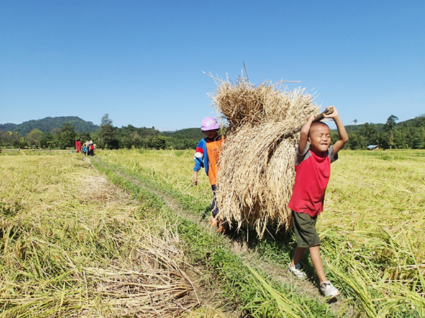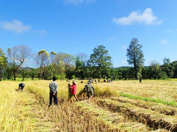 チュレ村での稲作はほとんどが手作業ということで、昔ながらの伝統的な稲作の形が今に残っています。機械化が進んでいく中で、村人たちと共に伝統的な手法や農機具、共同のスタイルなど少数民族の文化を受け継ぎ、守っていく事も虹の学校の重要な役割です。