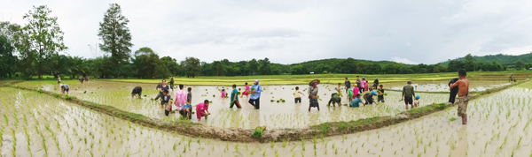 虹の学校ではチュレ村の仲間と共に、ほとんどが手作業の稲作を行なっています。