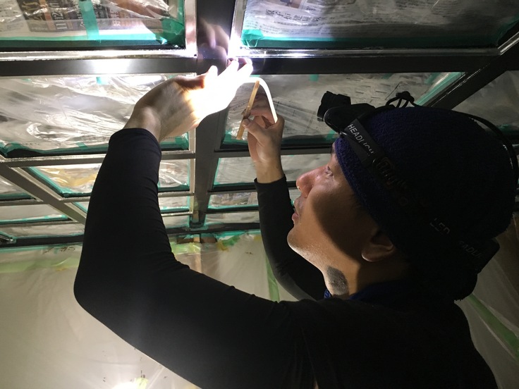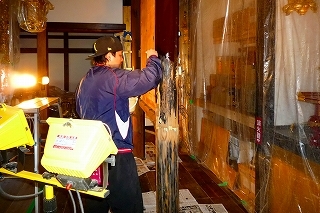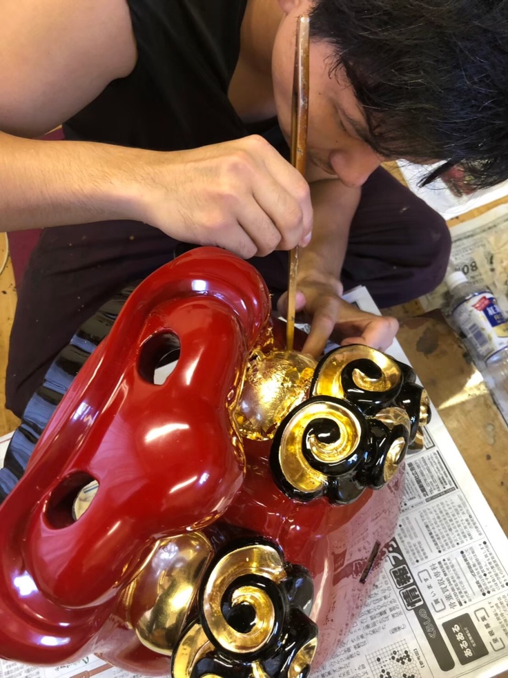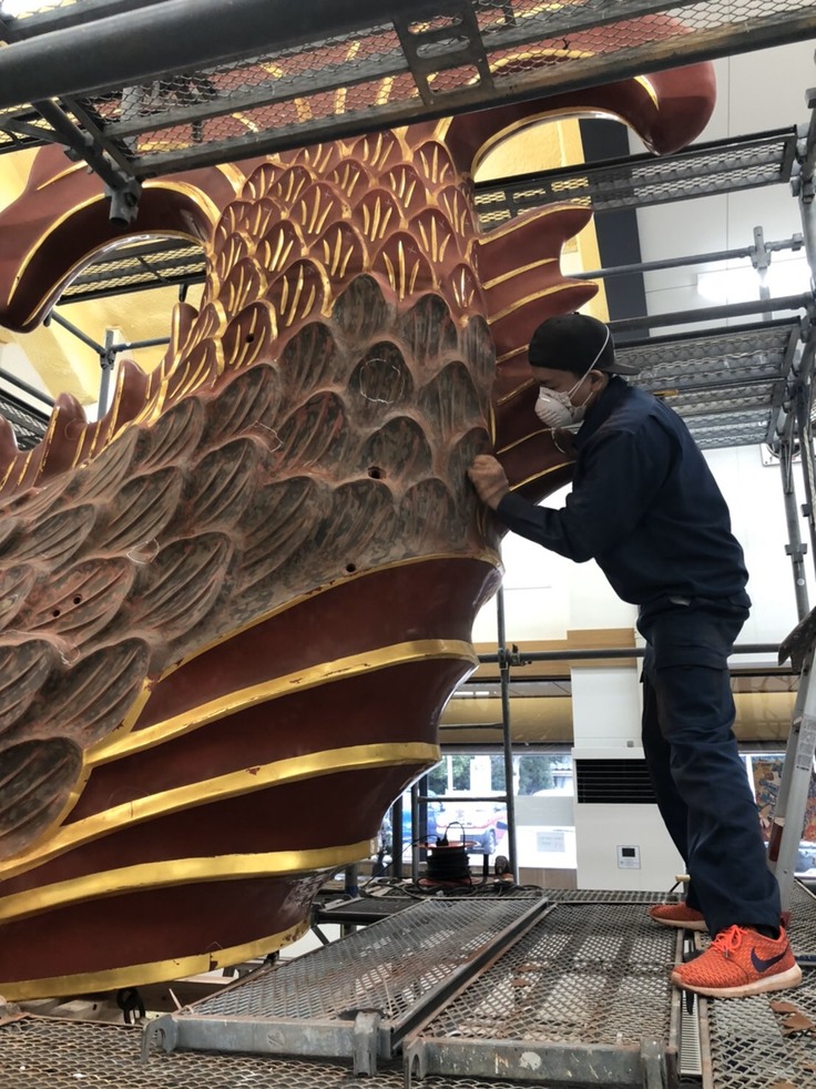 前回の能登半島地震(平成19年3月29日発生)で傷んだ輪島市の総持寺祖院放光堂の修復や、唐津くんちの修復チームに参加し、昨年は輪島市のキリコ修復の塗箔工程を担当しました。