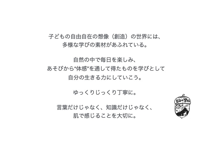 お山っこたちは、自分の好奇心から生まれる探究心をめいっぱい満たして一日を過ごし、「また明日~!」って、次の日が来ることを楽しみに帰って行きます。