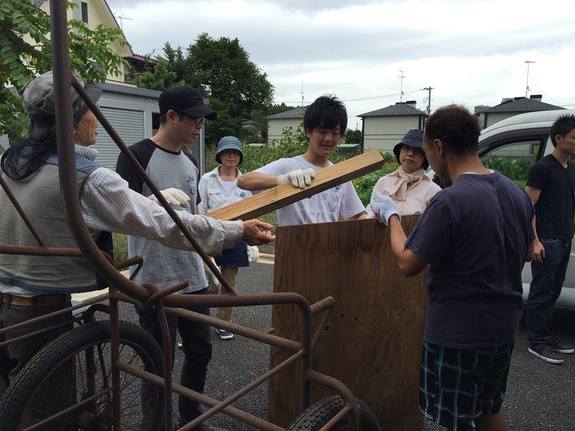 前回に引続きリアカー修繕がメインとなるこの日。「2号機」の製作にあたり、リアカーの構成を相談しました。単なる荷台ではなく、販売台としても使えるよう板の取り外しを可能にするため、レールで板をスライドできる造りとすることが決まりました。