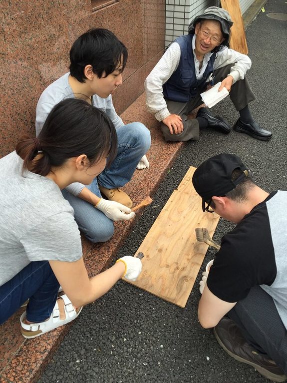 そして、いよいよリアカー整備に取り掛かります。頂いてきた廃材をリアカーにあて採寸し、ノコで切った板に柿渋を塗りました。前回の経験もあり、作業は快調に進みましたが、塗った柿渋を乾かす間、不安定な天気に自然とテントに人が集まりました。
