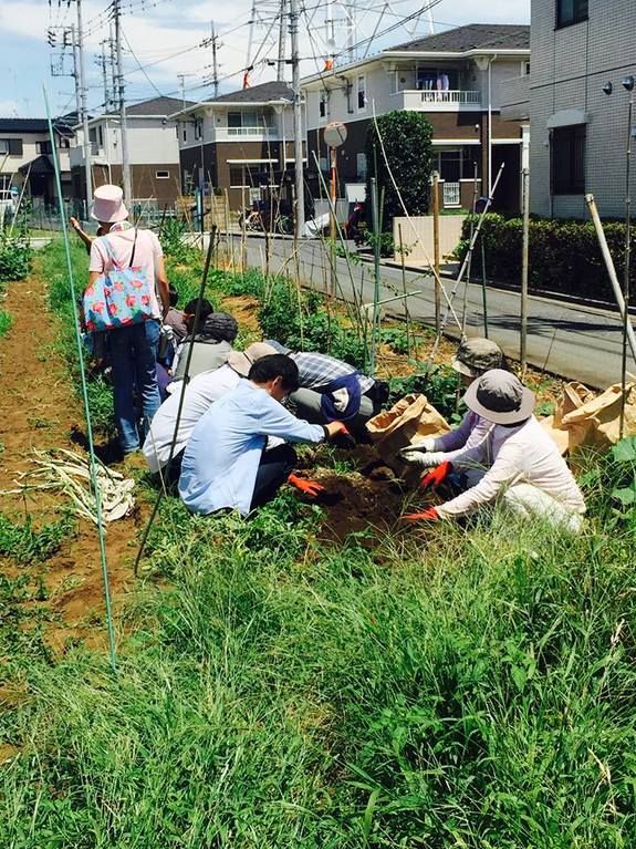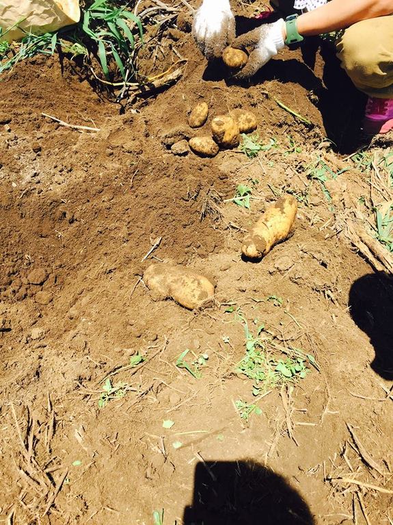 そして、今回のWSのメインイベントは、野瀬さんの畑でのジャガイモ掘りです!掘ったジャガイモはホッカイコガネという品種のものです。野瀬さんの指導のもとみんなでジャガイモを掘り進めていくと、子どもたちが土の中でジャガイモや虫を見つけたことを喜ぶ歓声と、大人たちが黙々と掘り進める真剣な表情が、いつもと違う雰囲気を醸し出していて、とても新鮮でした。暑さも忘れ一生懸命にジャガイモを掘った後には、参加者の皆さんの顔に、達成感と少々の疲れが見えました...。私も小学生以来のジャガイモ掘りで、とても楽しく体験することができました!