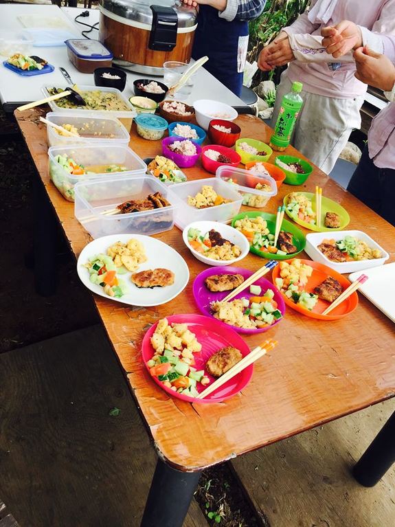 ジャガイモ掘りが終わった後は、お待ちかねの昼食の時間です!土用の丑の日ということで、大豆と山芋で作った、なんちゃってウナギや冷汁をご飯にかけて食べるといった夏らしい工夫が凝らされた食事は、暑い中でもスッキリと食べることが出来ました!参加者からは美味しいとの絶賛の嵐が起きました!