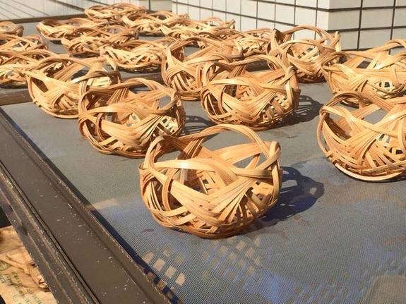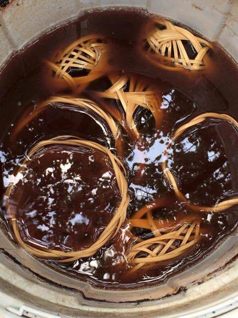 途中大雨に見舞われましたが、直売に避難して引き続き柿渋作りを続け、雨上がりに二年ものの柿渋ボトリングと一年ものを濾す作業が出来ました。日が射すころに、青鬼さんが作ってくれた竹細工を柿渋で染めたりも出来ました。