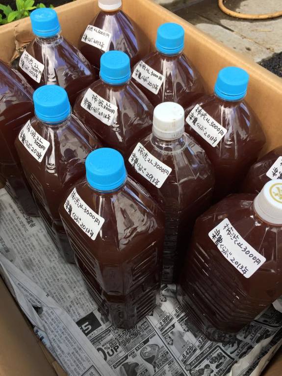 二年目の柿渋エキスをペットボトルにボトリングして、販売用として更に寝かせ、保管します。
