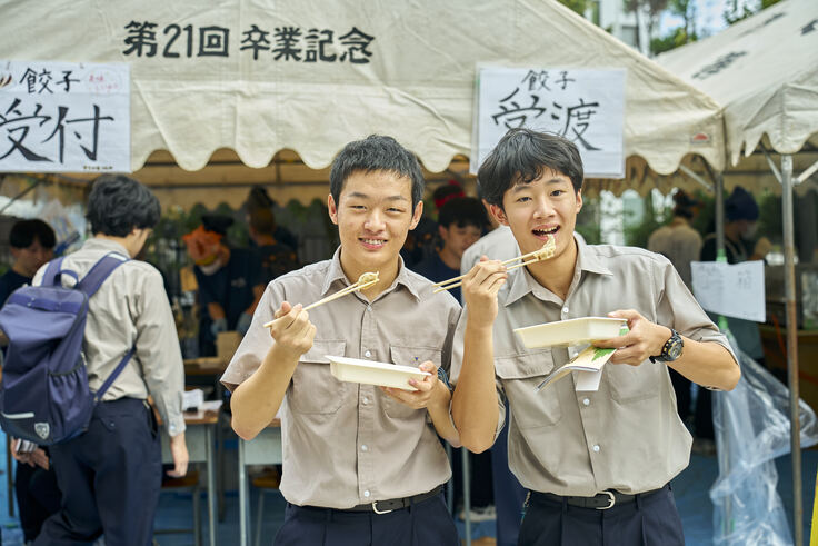 バドミントン部とともに、模擬店で餃子を販売しました。美味しそうな匂いに引き寄せられ、客足が途絶えませんでした。曇り空が広がる中でも、部員たちは大きな声、満点の笑顔で、購入者との関わりを楽しみました。
