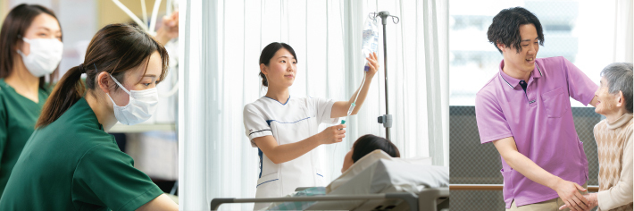 洛和会ヘルスケアシステムは、京都の街で病院やクリニックをはじめとする医療施設を中心に、介護、保育、健康診断、障がい福祉などの事業を展開しています。また、看護師や助産師を育てる看護学校も運営しています。