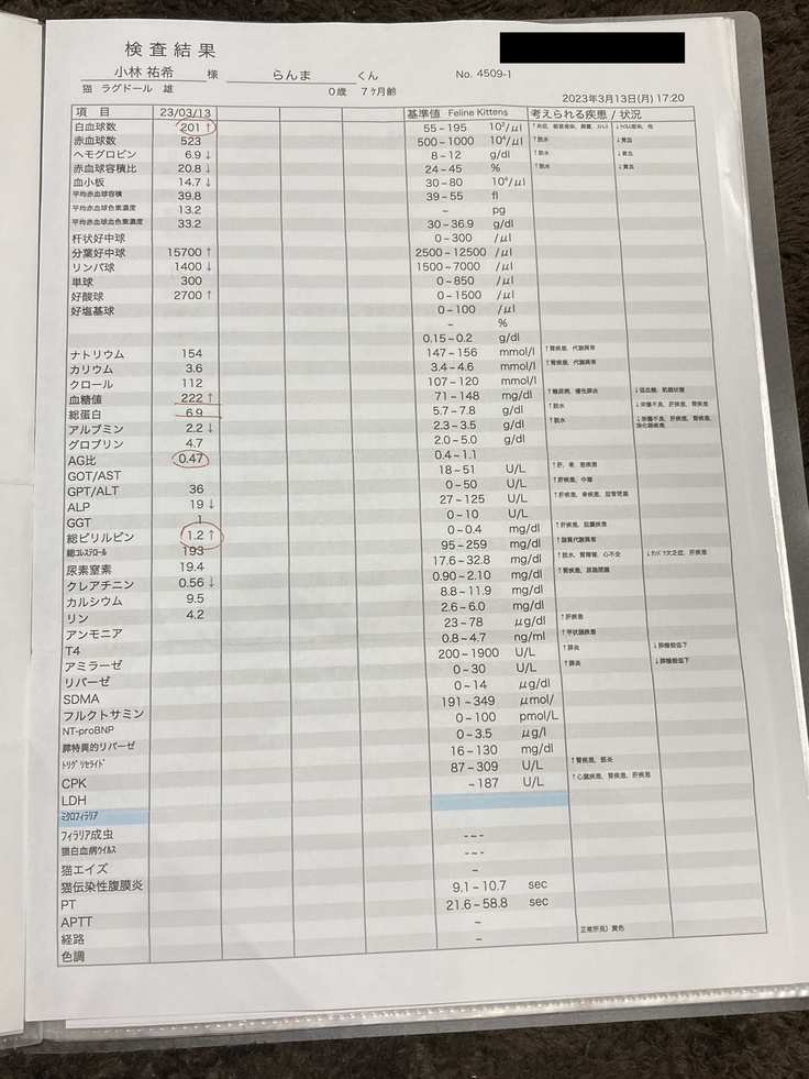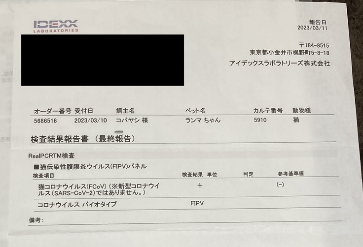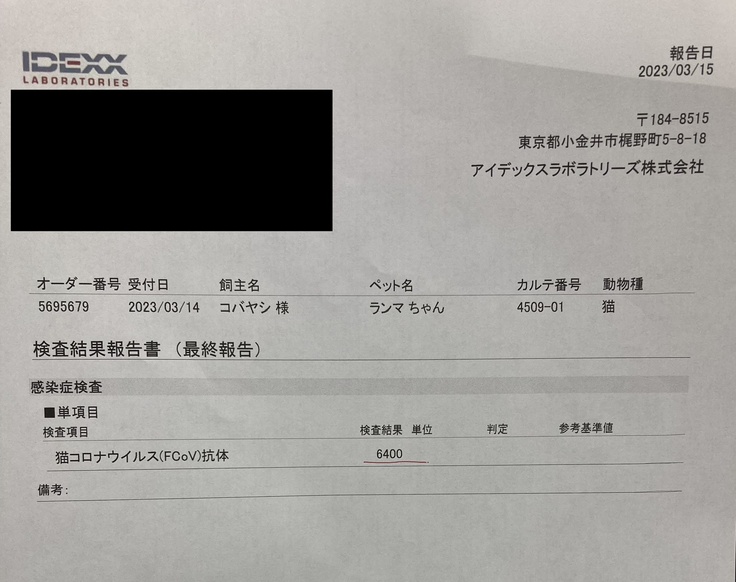 猫コロナウイルスの抗体値から確実にFIPで間違いないと確信をいただきました。