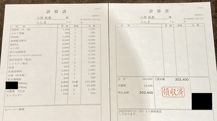 血液検査やレントゲン、エコー検査、外部検査などたくさん調べていただきました。