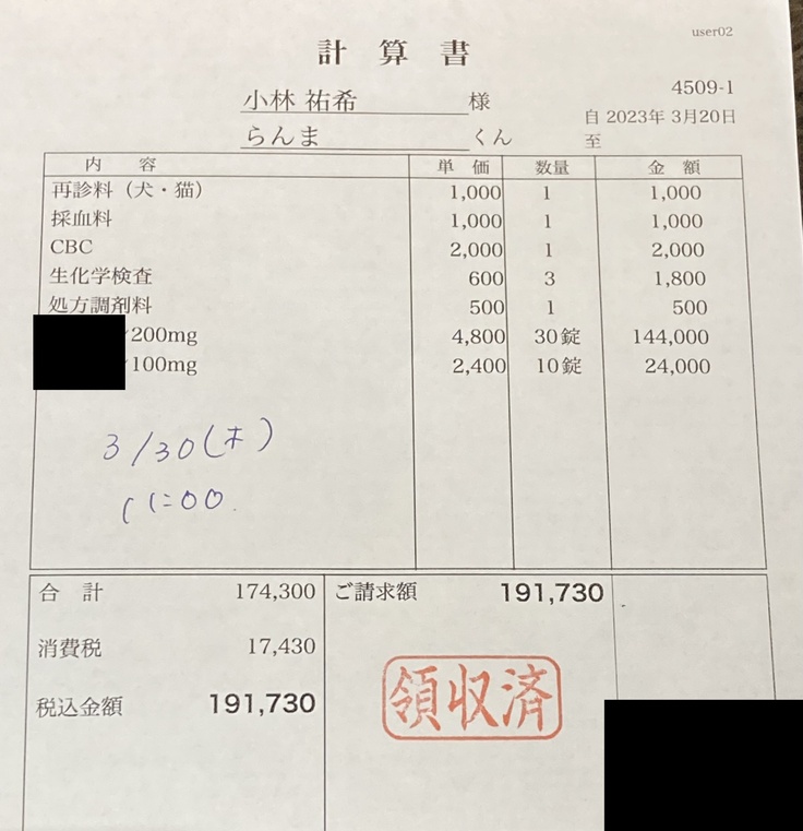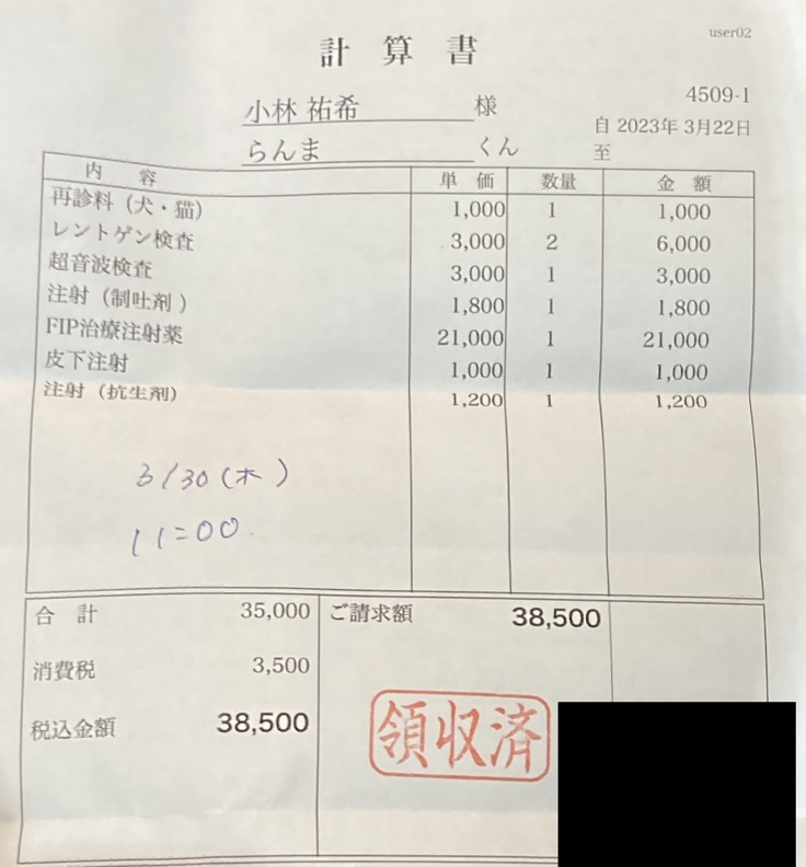 翌日3/13予約が取れたのでFIP治療の病院に行きました。