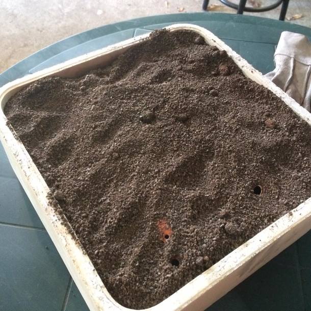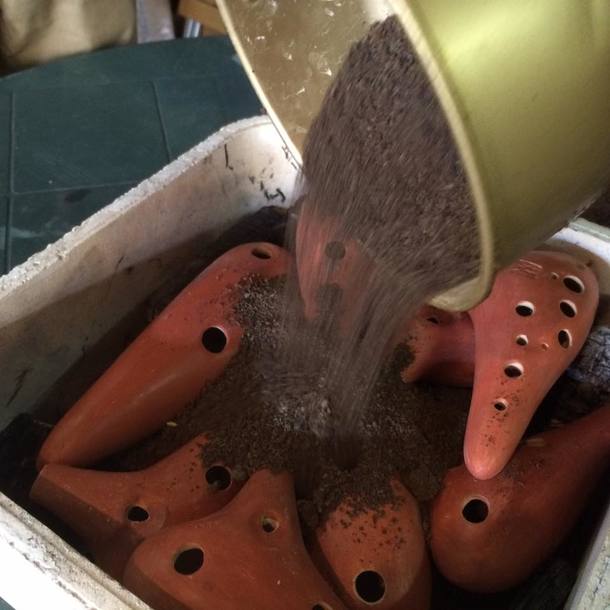 コーヒーガラはサヤに詰めたオカリナにかけます。