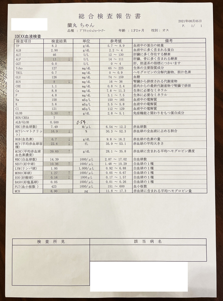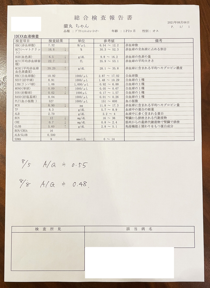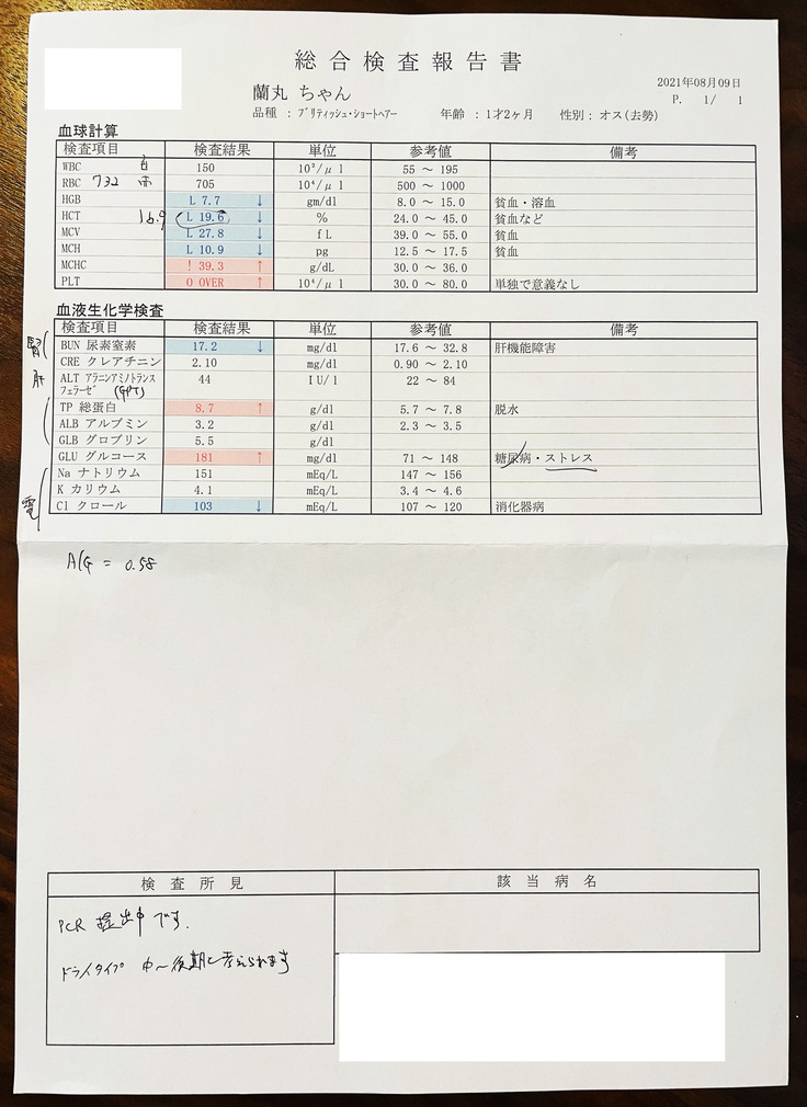 急いで病院に行くと39℃台の発熱、脱水症状、そして前回からさらに体重減少があることから血液検査をしていただきました。