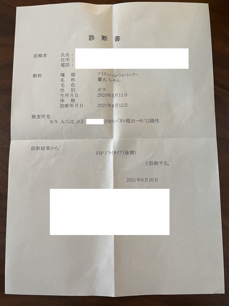 そこで検出された数値を見て、獣医さんから「FIPの疑いがある」とのお話を受けました。