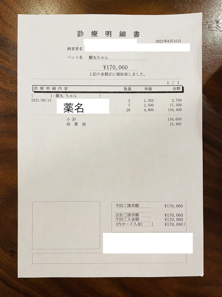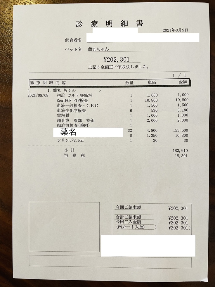 また蘭丸はこの病気の中でもさらに珍しい成猫での発症となるため、通常よりも多量の薬の服用が必要となり、一般的なFIP治療の数倍の費用が必要です。
