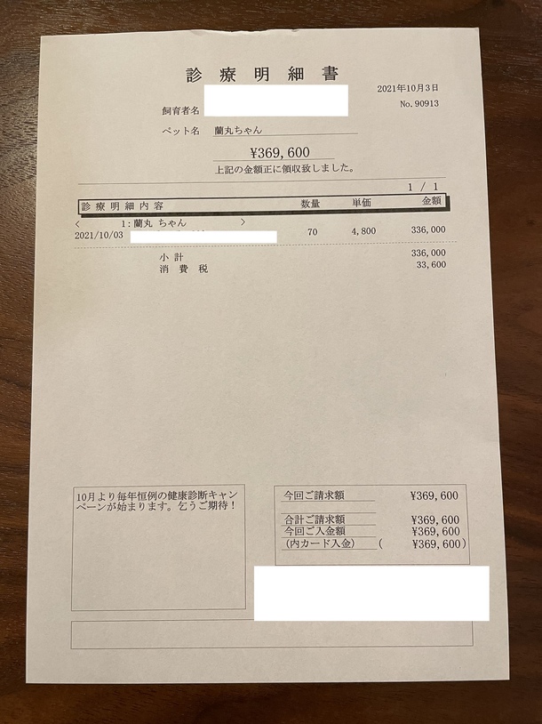 10/3の支払明細書です。薬名は伏せさせていただいております。