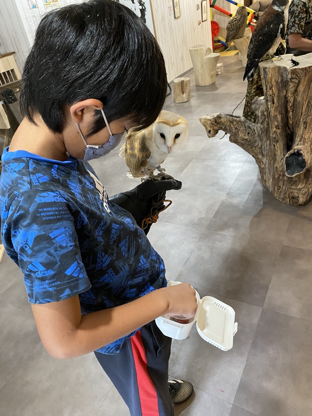 主に『据え』といってフクロウを腕に乗せてもらったり、『据え回し』と言ってフクロウを腕に乗せて歩く体験をしてもらいます。ありがとうのごはん🍖をあげることもしてもらいます(^-^)慣れたら、少しだけ外へお散歩もしていただく体験となります♪