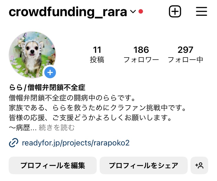 ららの元気に回復した姿が投稿できるようにプロジェクト成功に向けて全力でがんばりますので何卒応援、ご支援、あと拡散お願いいたします🙇💦