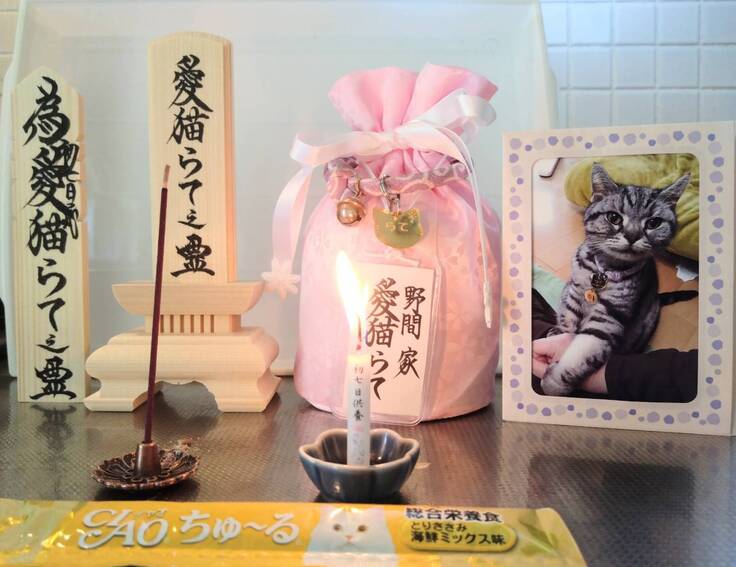 ちゅーるを供え、手を合わせ、ラテに話しかけました。