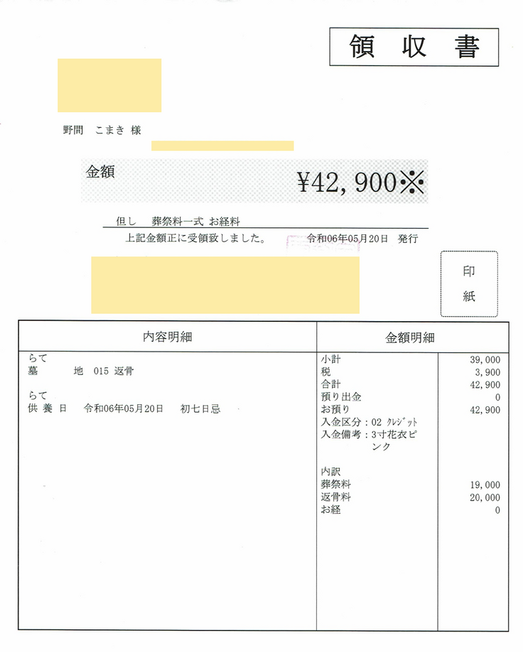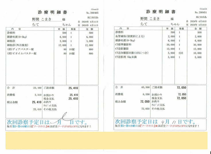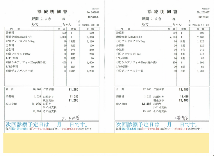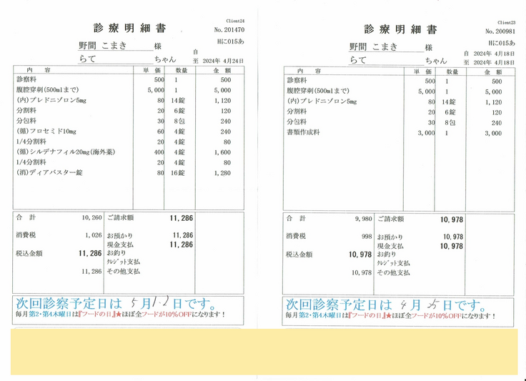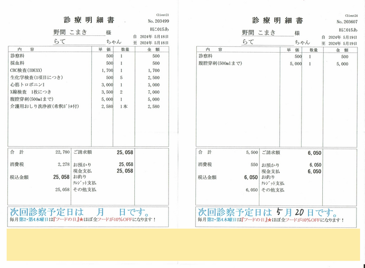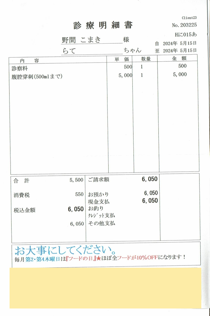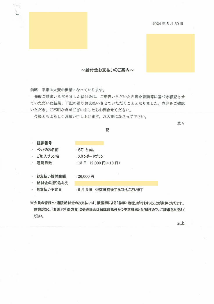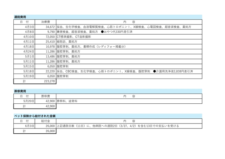 以下の通り、ラテの医療費と葬儀費、保険給付金につきご報告いたします。
