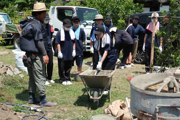 この日の現場には、高梁中学校の生徒たちも参加。体験学習として、モルタルの手練り作業を行いました。はじめてとは思えない手つきで、みるみるうちに作業をこなしていく中学生たち。