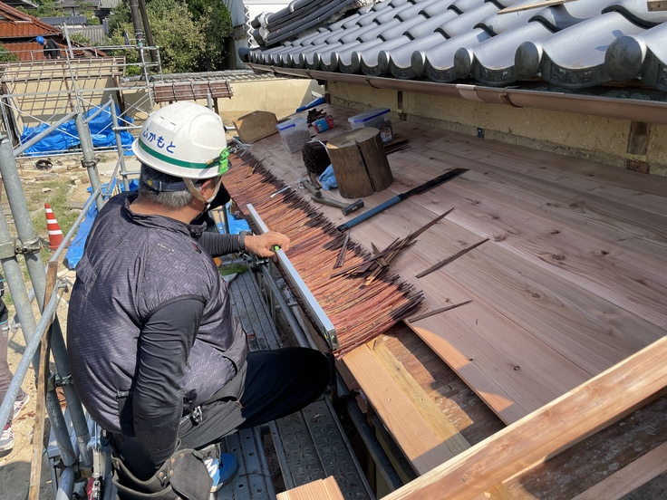 現場では職人の手で一枚ずつ檜皮が重ねられていきます。
