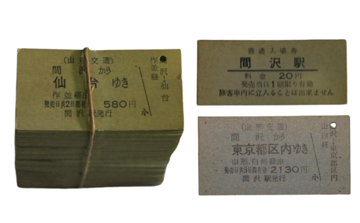 「間沢駅入場券」、「間沢ー東京都区内乗車券」、「間沢ー仙台間乗車券」の3枚セットとなります。