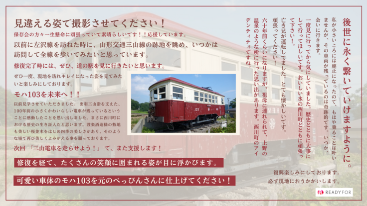 いよいよ「100歳を迎える奇跡の木造単車、モハ103を未来へ|山形交通三山線」プロジェクトも、本日23時を持って終了となります。現在のご支援は13,280,000円、ネクストゴールまであと1,720,000円というところまで来ています。