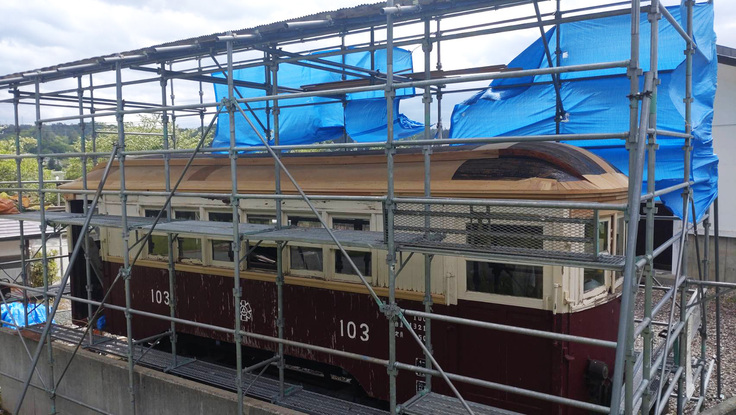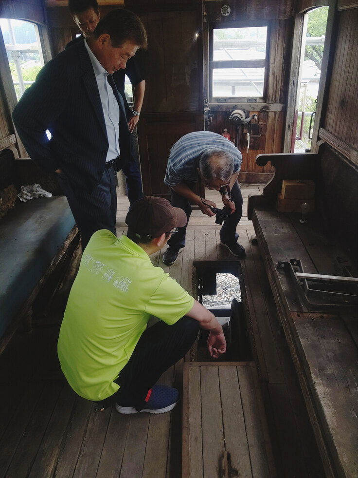 4月から車両の修繕を始め、作業が進む中で、少しずつ皆様にも見学していただける段階になって参りました。当日は保存会からモハ103の概要と修復状況をご案内した後、お客様には車両の内外を自由に見学していただきました。