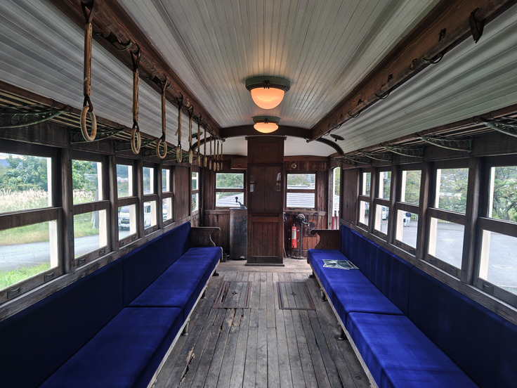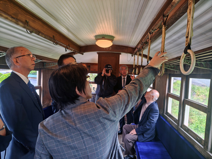 式典後には、参列いただいた皆様とともに記念撮影が行われ、その後、修復されたモハ103車両内の見学会が開催されました。車両内には紺色の座席シートや照明、当時使われたつり革も付けかえられ、往時の姿が再現されていました。さらにはヘッドライトも点灯され、蘇った車両の美しい姿に多くの方々が感動の声をあげておりました。見学会は、懐かしい風景に思いを馳せながら、参加者同士の思い出話にも花が咲き、終始にこやかな雰囲気に包まれていました。