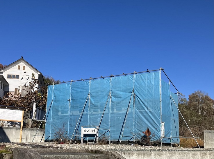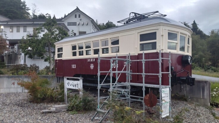 現在、皆様のお力で修繕されたモハ103は、これからの積雪などに備えるために修繕前に架けていた仮設の屋根を戻し、新たに防風シートをかけた状態で保存されております。来春にはまた美しい姿を皆様の前にお見せできることと思います。