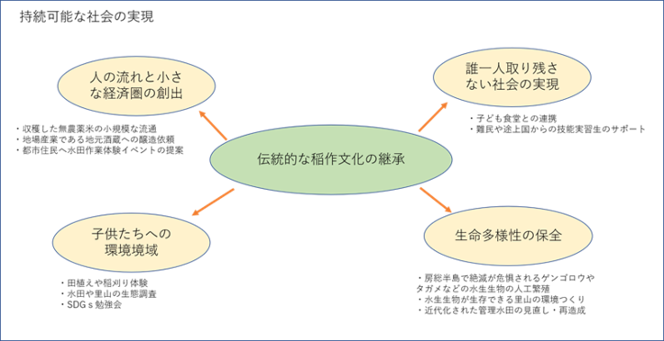 ②人と経済の流れを生み、平等な社会の実現に貢献する田園部の過疎化の影響で、耕作放棄地をはじめ、里山の荒廃が深刻である。本プロジェクトを通してこうした人の流れを作り、再び豊かな地域社会の創出を目指す。収穫した米は子ども食堂への寄贈や、地元酒蔵での限定酒醸造、関心を抱く人々への提供など様々な用途に応用することで社会に貢献する。
