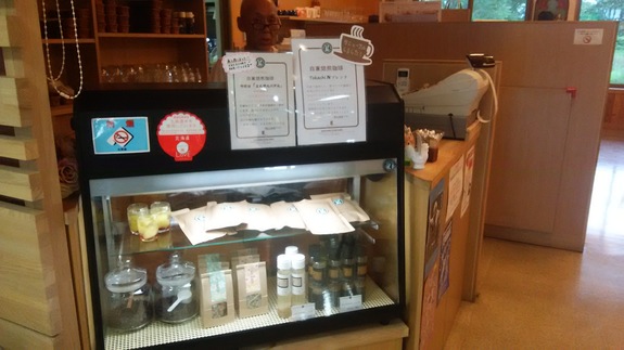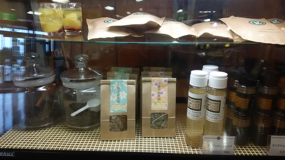 自家焙煎のオリジナルコーヒーや自家製ドレッシングのショーケースのなかに、ハーブティーも並べて頂いています♪
