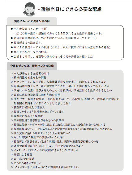 ここでは選挙当日にできる必要な配慮の例と今後必要な配慮、仕組み等の解決像のアイディアを掲載しますので、よろしければご覧下さい。