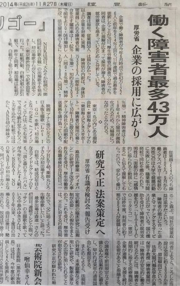 先日の新聞でも平成30年雇用義務化に向けて精神障害者の雇用が大幅増という記事がありましたので、ここにご紹介させていただきます。