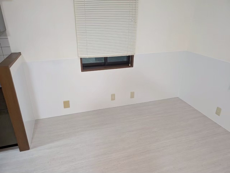 フローリングの床、壁に長尺シートとキッチンパネルを貼ることで