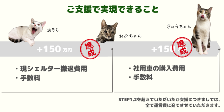 現在自家用車一台のため、もう一台、TNR時の猫の搬送等やお客様のお迎えで使う社用車があると活動の幅が広げられます。撤退費用に充てることを最優先としつつ、可能であれば社用車の購入費用にも活用させていただけると大変ありがたいです。