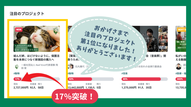 【17%突破!】皆様のあたたかい応援により、注目のプロジェクト第一位に掲載されました!