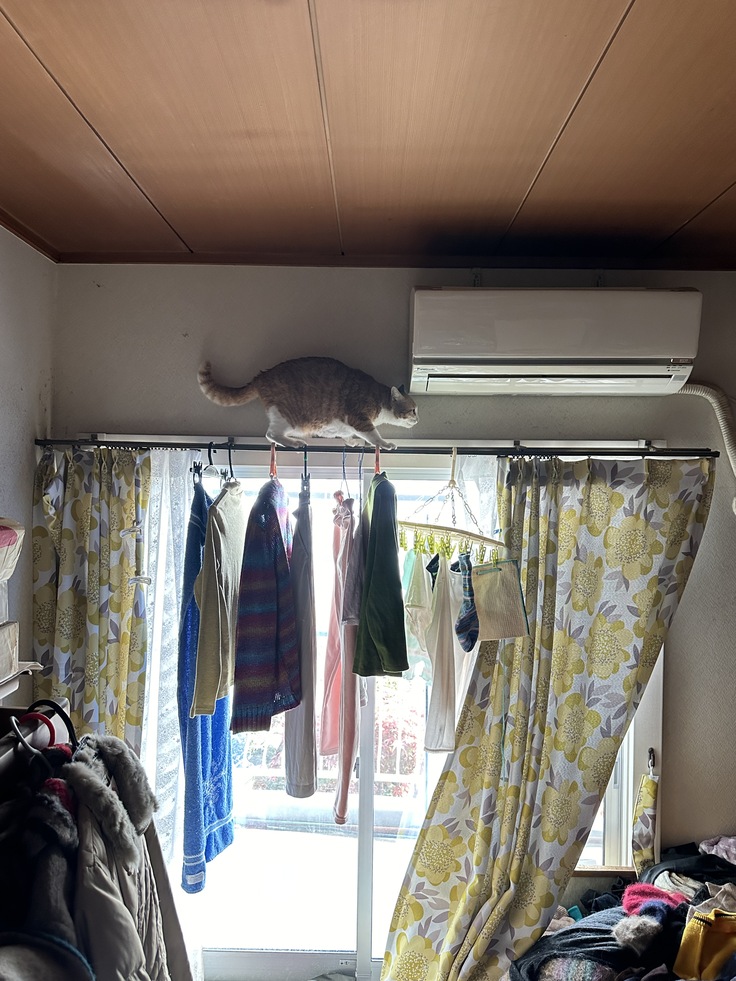 荒れたお部屋には猫ちゃんの写真、カレンダー、小物がたくさん。