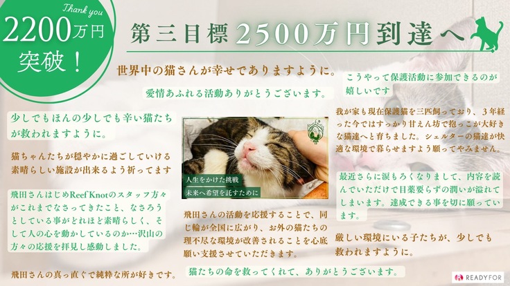 保護動物に寄せてくださる皆様のお心のおかげで、5月12日は第一目標の1,600万円、そして5月20日には第二目標である2,200万円も達成することができました!! 本当に、本当に、本当に!!!応援ありがとうございます!!!