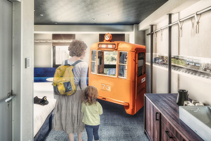 引退車両のパーツをもちいて『伊予鉄ルーム』という、鉄道車両をコンセプトにした客室をつくります。車両の中にいるような空間から、街を走る路面電車を眺められる最高のビューで、旅の癒しと特別なお時間をご提供いたします。
