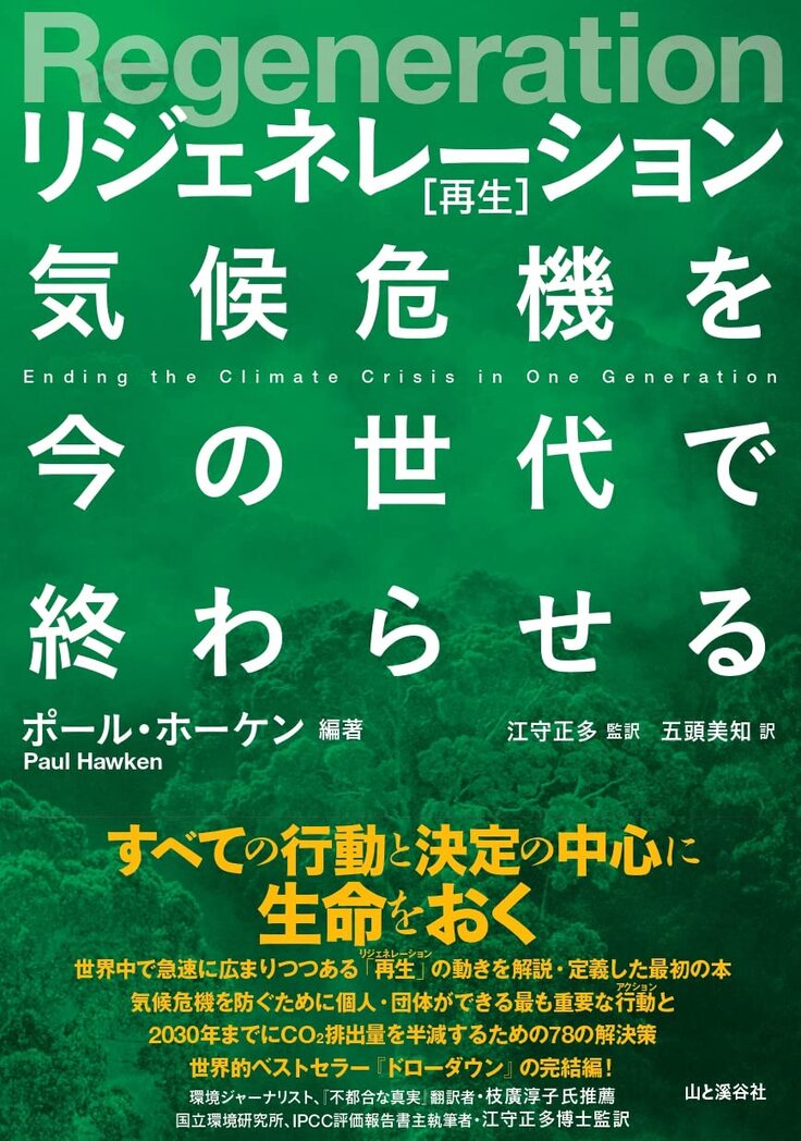 『リジェネレーション[再生]』は、世界中で急速に広まりつつある「リジェネレーション(再生)」活動を説明し、定義した初めての本です。気候危機を防ぐために個人・団体ができる最も重要な行動と2030年に排出量を45〜50%削減するための70以上の科学的根拠に基づいた解決策を紹介しています。