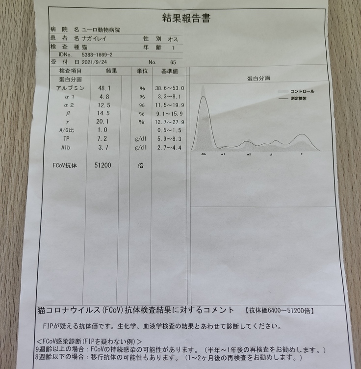 先生によると「A/G比の1.0はひじょうに良い、蛋白分画も普通の猫と同等、猫コロナウイルス抗体は高いがFIPにかかったんだからそれぐらいはまあ当たり前」ということでした。