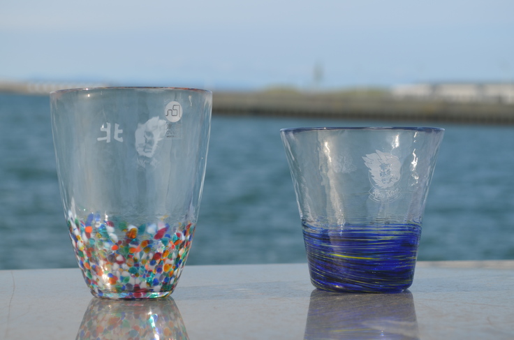 ラインメールカラー(青×黄色×黒)のオリジナルびいどろと、ねぶたカラー(カラフル)のびいどろの2個セットの商品です。どちらもラインメールエンブレムの彫刻が入っているクラウドファンディング限定品です。